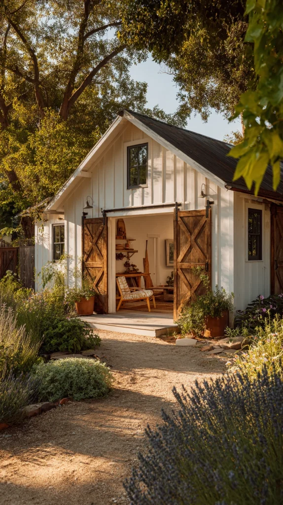 Build a charming garden house with board-and-batten siding, steep gabled roof, and vintage-inspired details like antique hardware and shuttered windows creating countryside appeal. Install reclaimed wood floors, exposed ceiling beams, and shiplap interior walls that reinforce the authentic farmhouse character throughout the space.