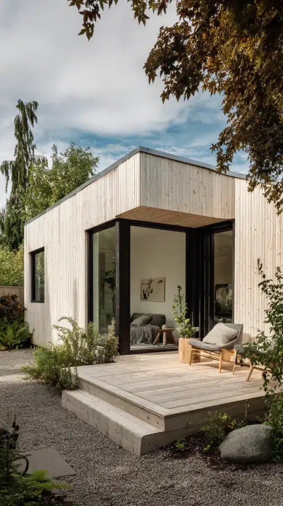 Embrace Nordic design principles with a garden house featuring natural wood exterior in light tones, large windows, and simplified forms celebrating functionality and natural materials. Keep the interior minimal with white walls, light wood floors, and only essential furniture arranged with plenty of breathing room and negative space. Add a small wood-burning stove or modern electric heater providing cozy warmth during cooler months while maintaining the clean aesthetic. Include built-in storage hidden behind seamless cabinet doors that keep clutter invisible and maintain the serene, uncluttered atmosphere.