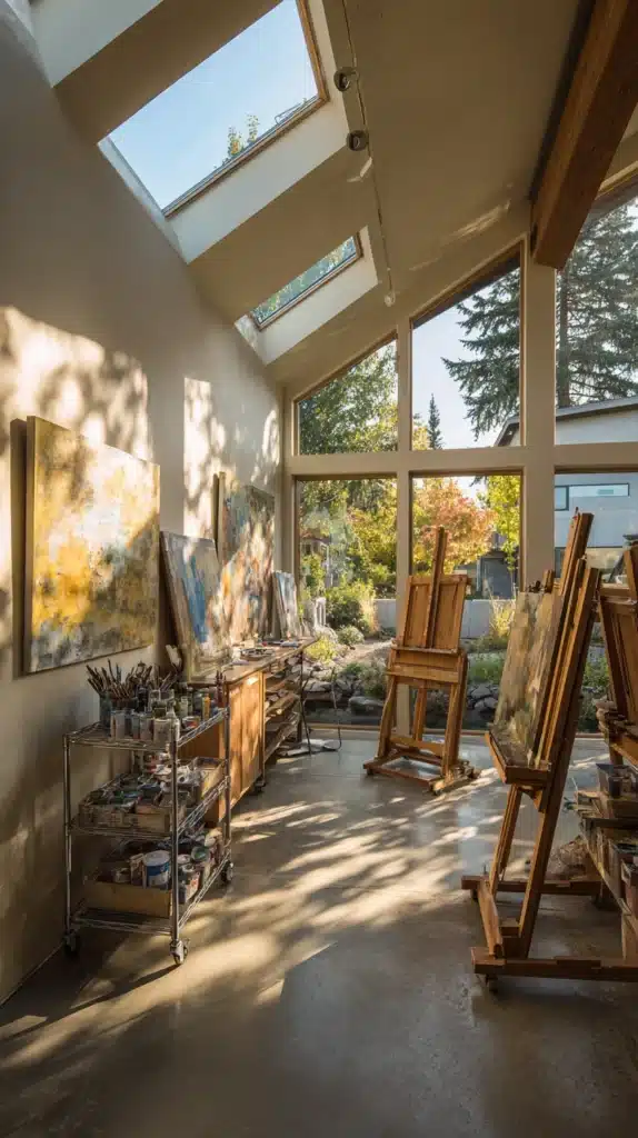 Design a purpose-built art studio with large north-facing windows or skylights providing consistent, even natural light throughout the day without harsh direct sun. Install practical features like deep utility sink, abundant storage for supplies, and durable flooring that tolerates paint spills and messy creative processes.