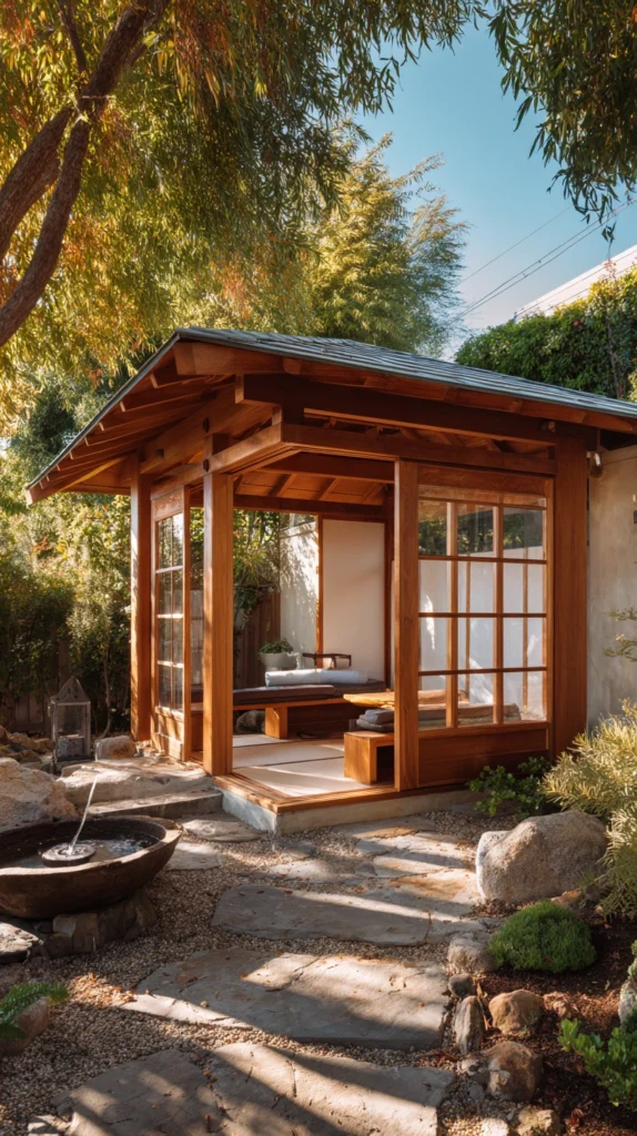 Construct a serene meditation and tea ceremony space featuring traditional Japanese architectural elements like sliding shoji screens, tatami mats, and minimalist interior design. Use natural materials including bamboo, rice paper panels, and unstained wood that age beautifully while maintaining the authentic aesthetic.
