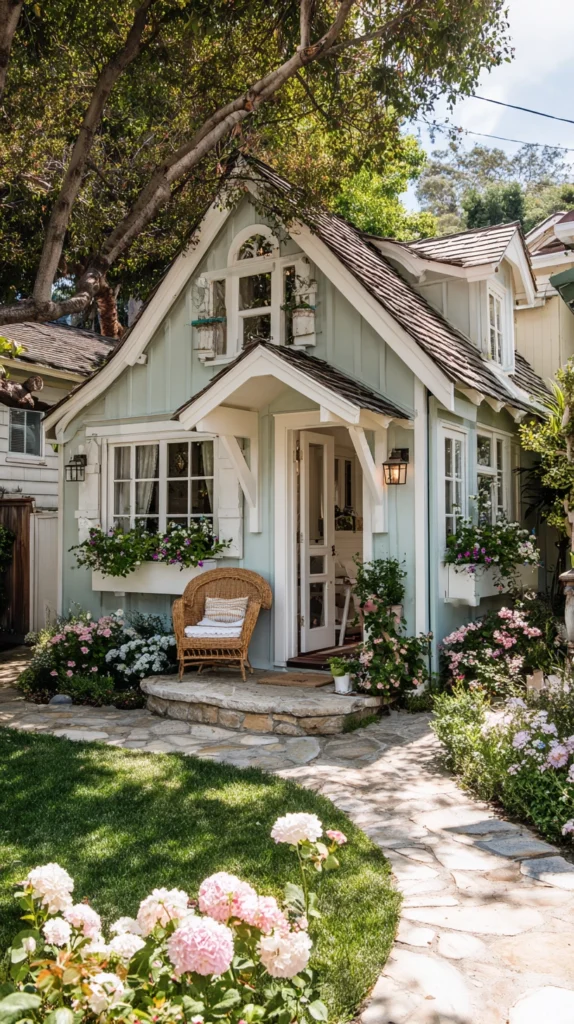 Design a welcoming guest accommodation with cottage architecture including cross-gabled roof, window boxes with flowers, Dutch door, and charming details creating storybook appeal. Outfit the interior with a comfortable daybed or Murphy bed, small kitchenette with mini fridge and microwave, and compact bathroom if space and budget allow.