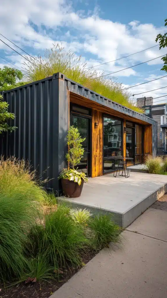 Insulate properly and finish the interior with wood paneling, polished concrete floors, and industrial-style fixtures creating a comfortable workspace or living area. Add a green roof planted with sedums or grasses that provides insulation while softening the industrial appearance from above.