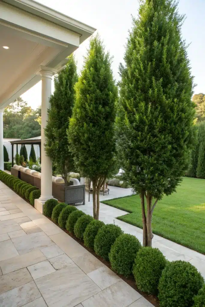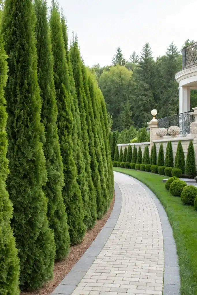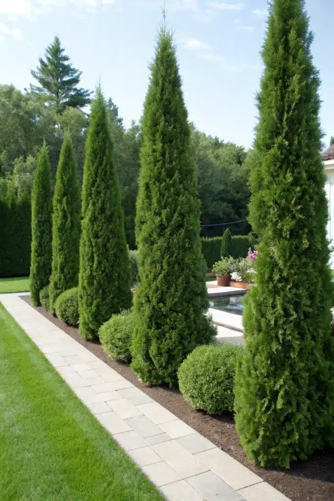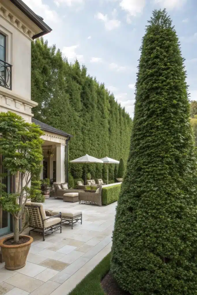 Arborvitae is a timeless favorite for backyard privacy thanks to its dense, evergreen foliage and low maintenance.