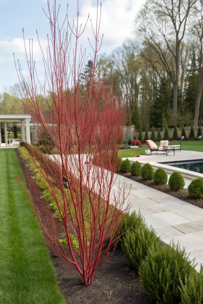 Add color and structure to your privacy garden with red twig dogwood, known for its vivid red stems in winter.