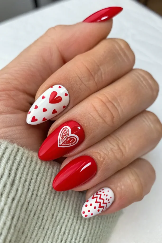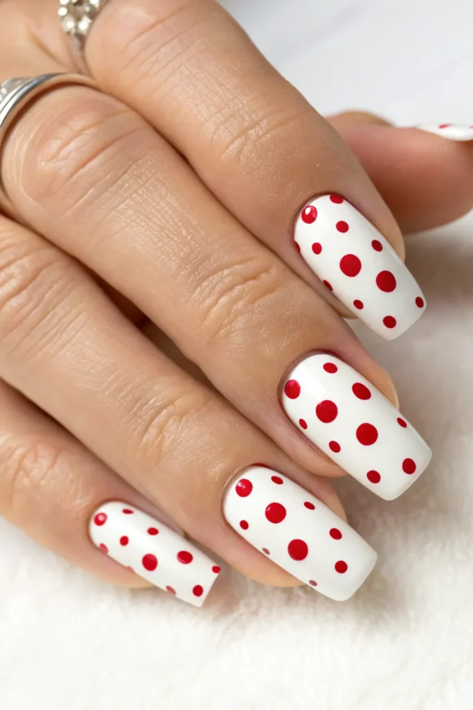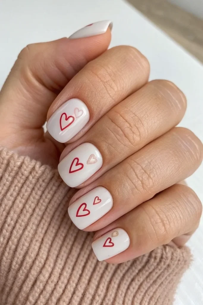 Simple yet eye-catching, white nails with red dots or tiny hearts give a minimalist Valentine’s aesthetic. This design works beautifully on short nails and is easy to recreate at home. Play with dot placements — along the tips, diagonally, or near the cuticle — to make it uniquely yours.