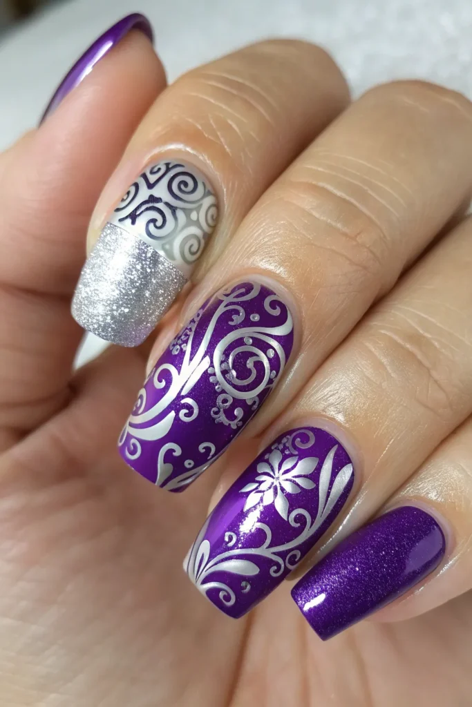 Purple and silver are an unexpected but stunning February combination. Lavender tones symbolize calm and femininity, while silver glitter adds a frosty winter sparkle. You can create French tips with silver foil or blend both colors into an ombré. It’s romantic, elegant, and ideal for transitioning from winter to spring.