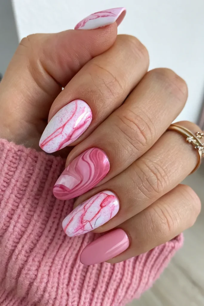 Marble nail art has become a timeless trend, and pink marble gives it a romantic twist. Combine shades of pink, white, and a hint of gold to create a fluid, luxurious pattern. Each nail becomes a piece of art that feels both delicate and high-end. Finish with a glossy topcoat for a smooth, stone-like texture.