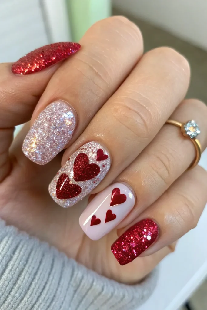 If you prefer a simple, elegant manicure, minimalist heart nails are the way to go. Use a nude or pale pink base and paint a tiny heart on one or two nails — either in red, gold, or white. This understated look adds just enough Valentine flair without being overly themed.