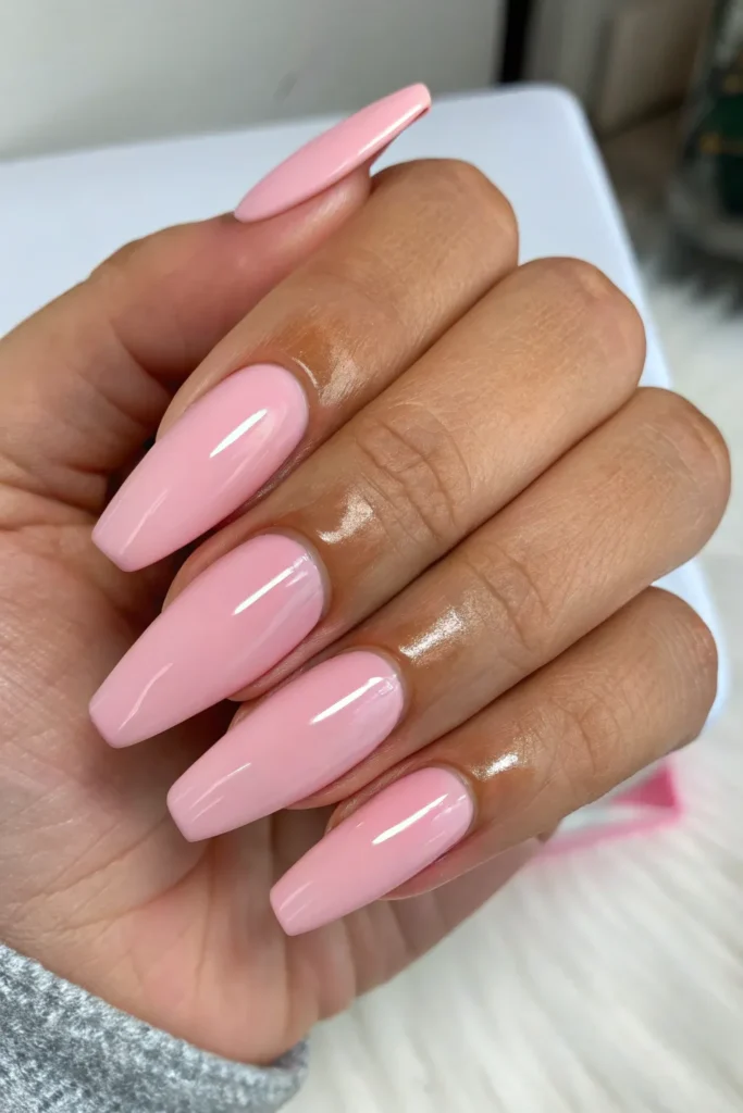 Soft blush pink is elegant and versatile, making it perfect for February’s cozy charm. Coffin-shaped nails highlight the delicacy of the color while adding a modern edge. Add a pearlescent sheen or a touch of white marble detailing for extra sophistication. This look is perfect for both workdays and date nights — subtle yet endlessly stylish.