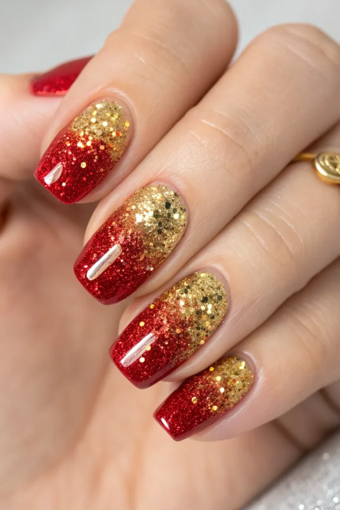 If you’re drawn to bold and glamorous nails, red and gold glitter tips are your go-to. Start with a red base and fade gold glitter from the tips for an ombré sparkle effect. This design complements evening outfits and the party looks beautiful. For extra dimension, use chunky gold flakes or a metallic strip across the tip.