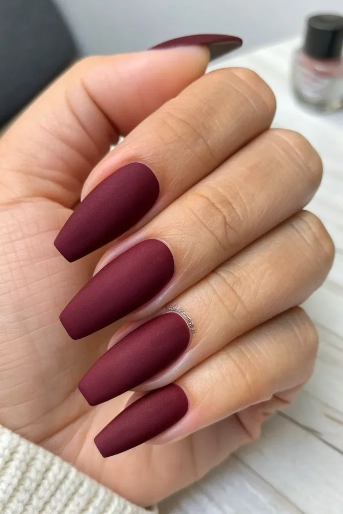 Burgundy is the sophisticated cousin of red — rich, dramatic, and perfect for February evenings. A matte finish enhances its luxurious depth, giving your nails a velvety look. Try adding a glossy heart or stripe on one accent nail to create texture contrast. This color pairs perfectly with gold jewelry and cozy winter outfits.