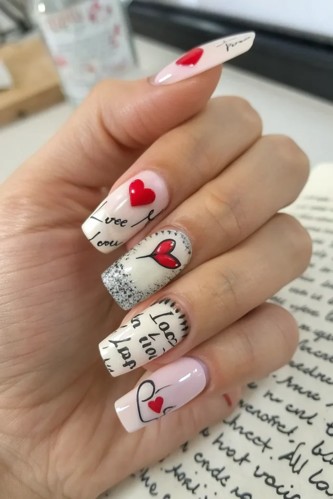Turn your nails into tiny romantic notes with love letter nail art. Small envelopes, initials, and hearts hand-painted or stickered on a neutral base look chic and creative. You can alternate plain nude nails with these mini “letters” for a cute, personalized manicure. It’s a playful design that tells a story right at your fingertips.