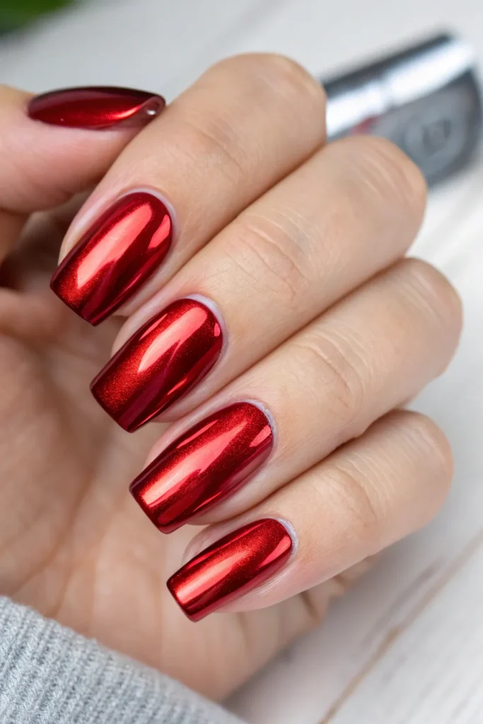 Chrome finishes are bold and futuristic, and when combined with red, they create an ultra-glam look. Red chrome nails reflect light beautifully and instantly draw attention. Pair them with minimal jewelry to let the nails steal the show. This design is perfect if you love standing out with a strong, confident aesthetic.