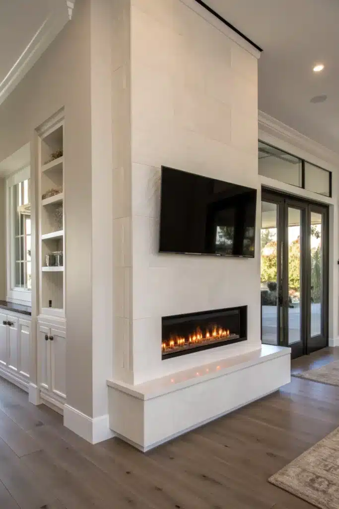 A vertical fireplace paired with a wall-mounted TV creates balance, especially when framed within the same material or color palette. Built-in shelving or cabinetry can help visually connect the two features. This approach works particularly well in wide living rooms or open-plan spaces.