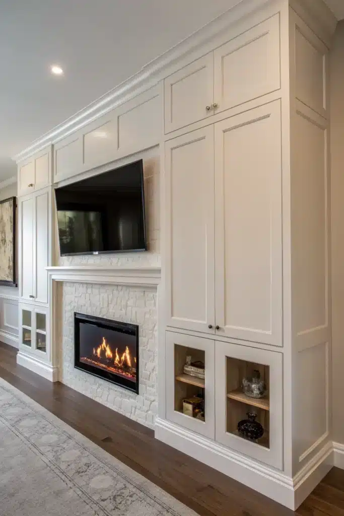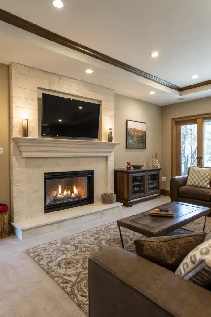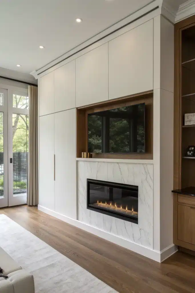For those who prefer a cleaner look, hiding the TV when not in use is a smart solution. Sliding panels, artwork, or motorized covers allow the fireplace to take center stage.