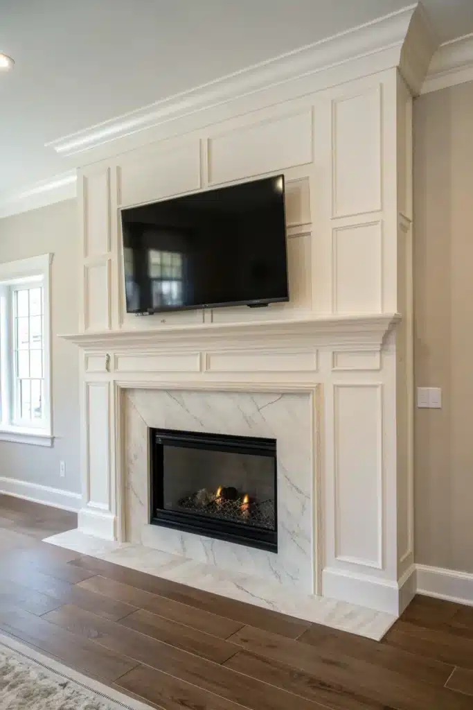 Using the same material to frame both the fireplace and TV creates a cohesive, modern look. Stone, wood, or plaster finishes visually link the two features.
