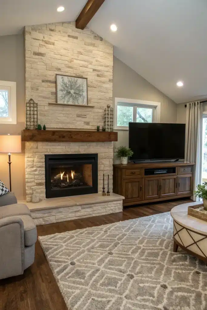 The fireplace remains the architectural anchor, while the TV is placed slightly to the side at a comfortable height. This works well when paired with built-in shelving or cabinetry that balances the offset visually. It’s an excellent option for living rooms that double as casual entertainment spaces.