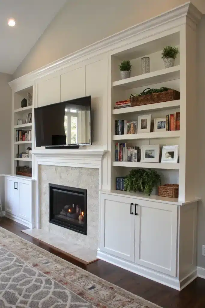 Separating the TV and fireplace with shelving creates visual breathing room. This layout allows each element to stand on its own while remaining connected through design.