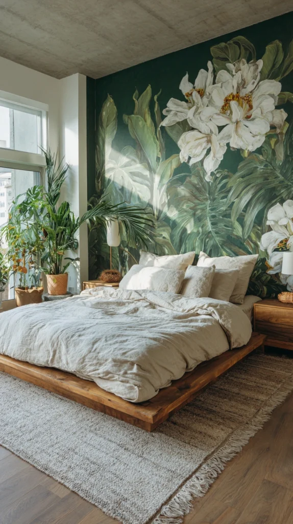 If you want to make a real statement, oversized botanical wallpaper is the way to do it. Large-scale floral prints featuring giant leaves, oversized blooms, and dramatic stems create an immersive, almost jungle-like atmosphere that feels both luxurious and exciting.