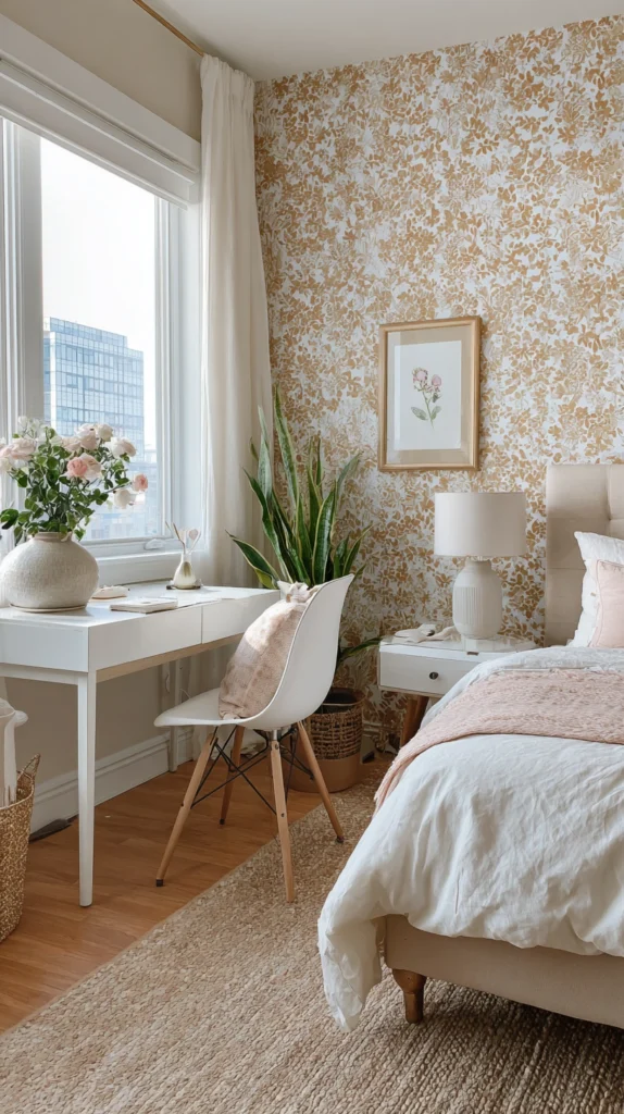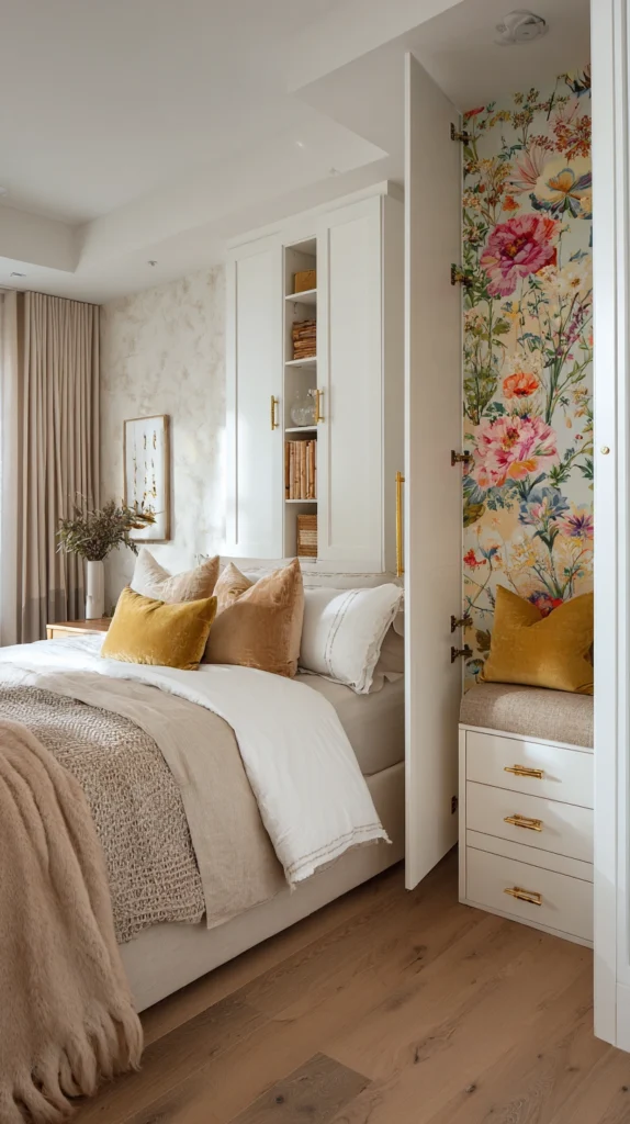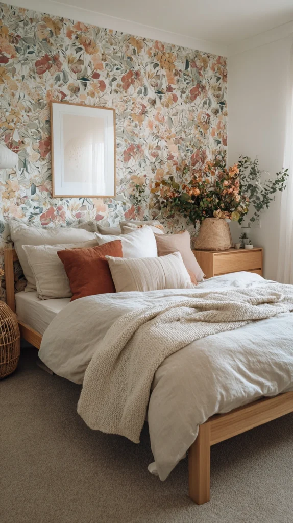 This approach lets you enjoy the impact of floral wallpaper without the full investment of time or money. It also gives the room a built-in focal point and creates visual depth that makes the space feel more intentionally designed.
