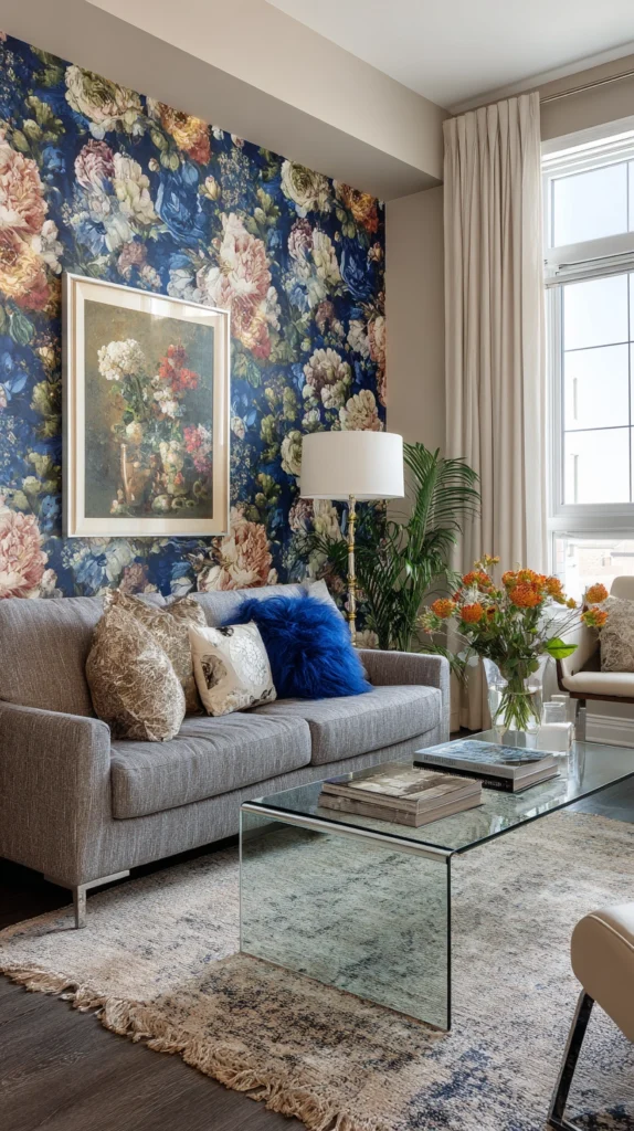 Not ready to commit to wallpapering an entire room? A single feature wall is the perfect compromise. Choose the wall behind your bed, sofa, or fireplace and apply a bold, eye-catching floral pattern there while keeping the remaining walls painted in a complementary neutral shade.