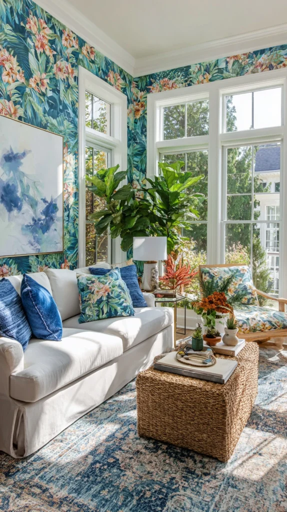 This style is particularly energizing in a bathroom, sunroom, or home office — spaces where you want to feel inspired and uplifted. It pairs beautifully with rattan furniture, woven textures, and natural wood accents that lean into the tropical aesthetic.