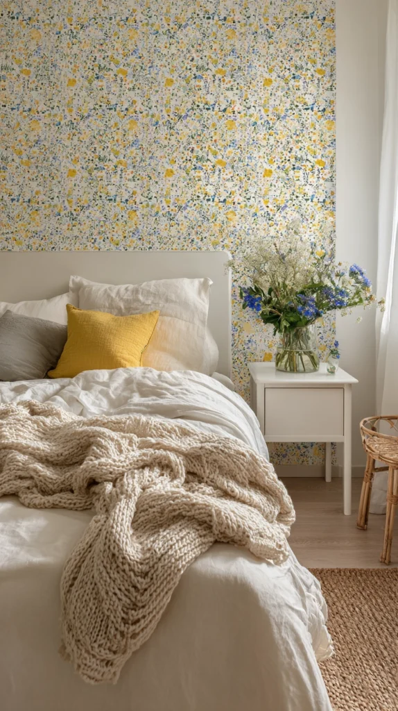 This style is ideal if you want floral without it feeling too loud or overwhelming. It works beautifully on all four walls of a bedroom, enveloping the space in gentle color and pattern without dominating the room. Pair it with white linen bedding and natural wood furniture for a look that feels effortlessly serene.
