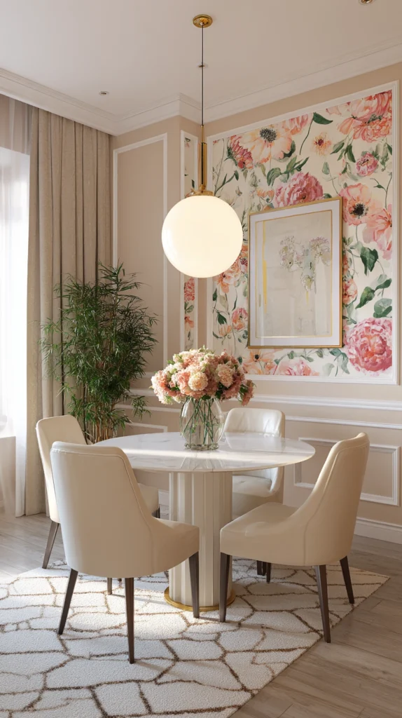 This traditional technique adds architectural interest to a room and gives the floral pattern a contained, structured feel that prevents it from overwhelming the space. It’s a great option for formal dining rooms, hallways, or bedrooms where you want a more polished, tailored look.
