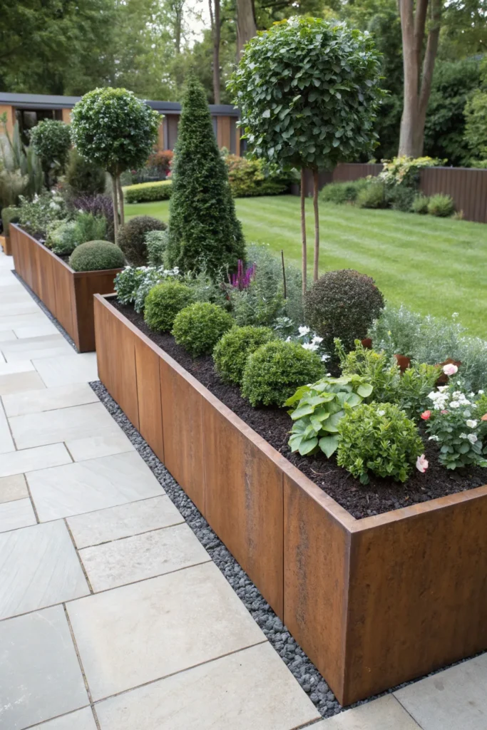 Tall metal planters double as edging and planting structure, creating dramatic height and defining garden zones.