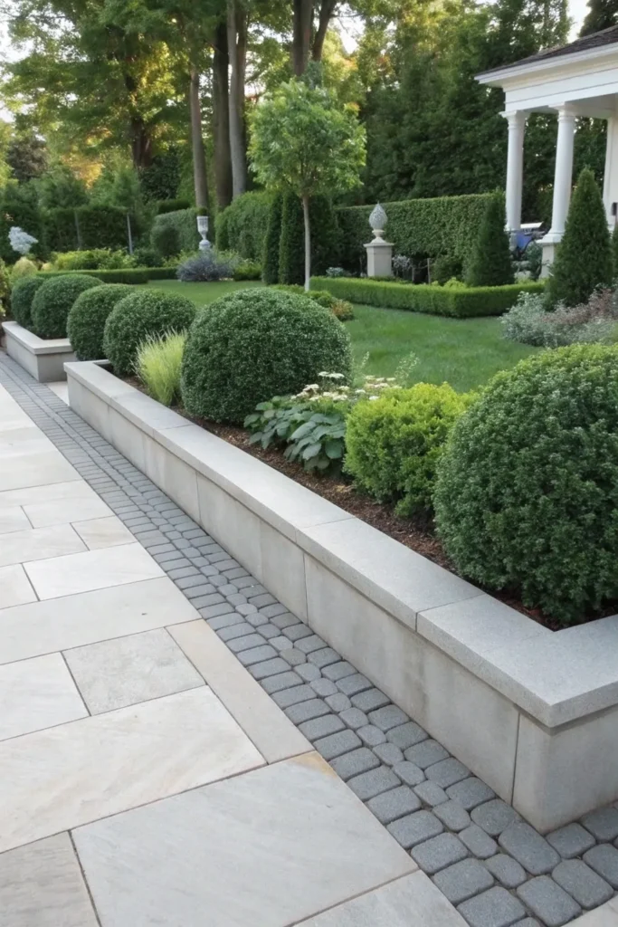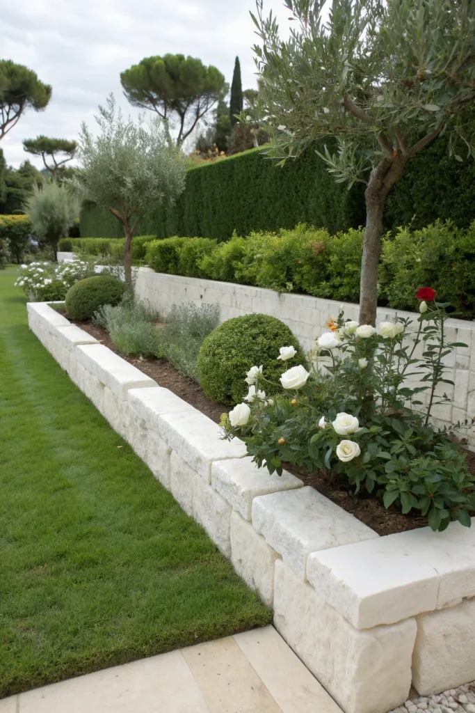 White limestone edging brightens garden spaces, creating a crisp and upscale border that feels both Mediterranean and modern.
