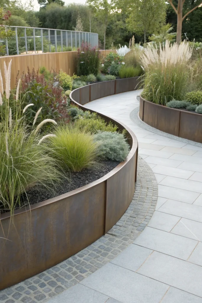 Curved steel edging allows soft winding shapes perfect for organic-flowing garden designs, blending modernity with nature.