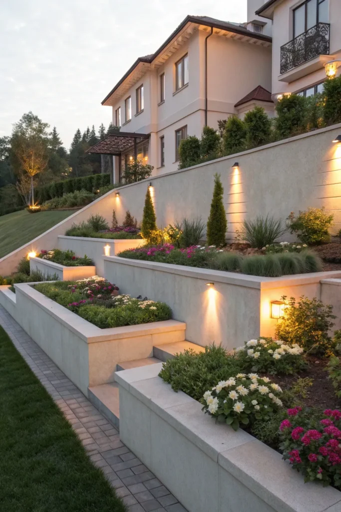 Short concrete retaining walls frame flower beds with a modern architectural finish, ideal for urban or elevated gardens.