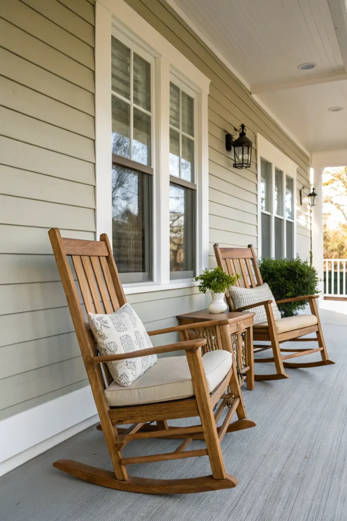 Few things say “welcome home” quite like a pair of wooden rocking chairs on a front porch. This timeless choice instantly creates a relaxed, nostalgic feel while remaining endlessly functional. Wooden rockers work beautifully on both traditional and farmhouse-style homes, but they can also add warmth to more modern exteriors when finished in clean lines and neutral tones.