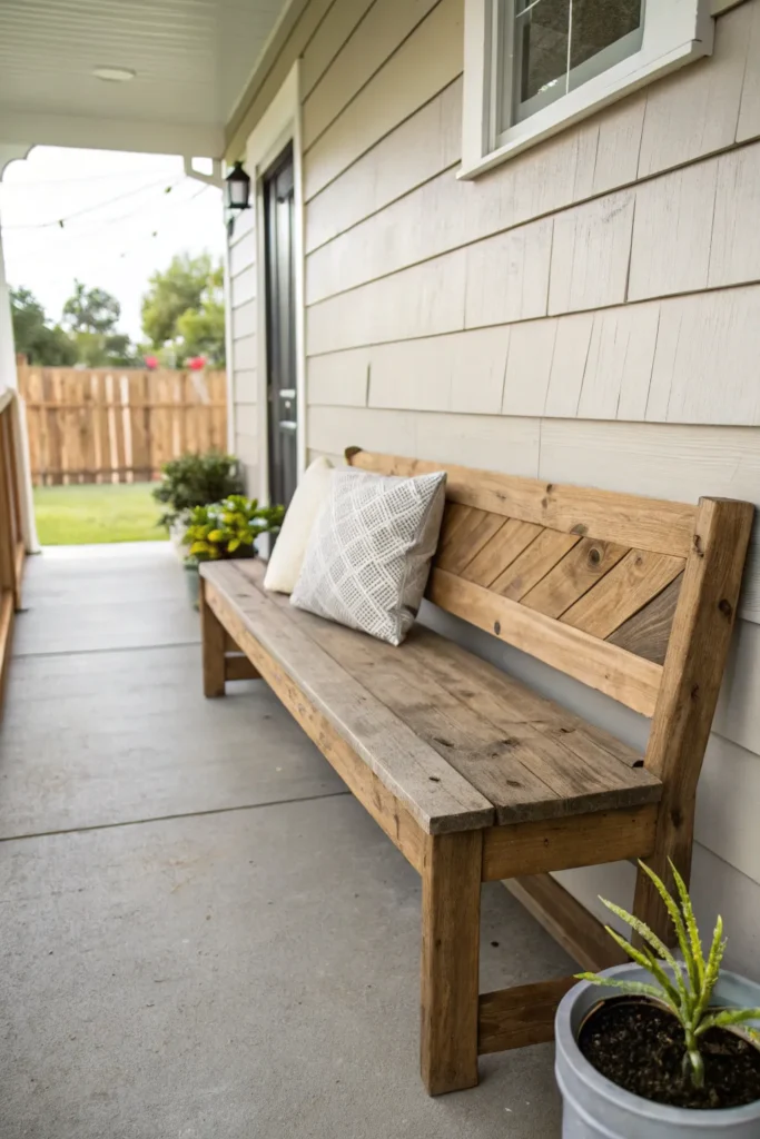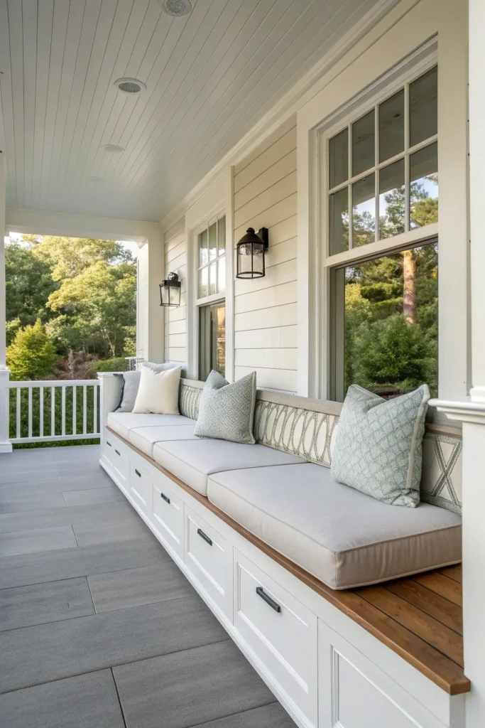 Built-in benches are perfect for creating a clean, tailored look on your front porch. They make excellent use of space, especially on narrower porches, and can be customized to fit the exact dimensions of your home. Built-ins feel intentional and architectural, which makes them especially appealing for modern or craftsman-style homes.