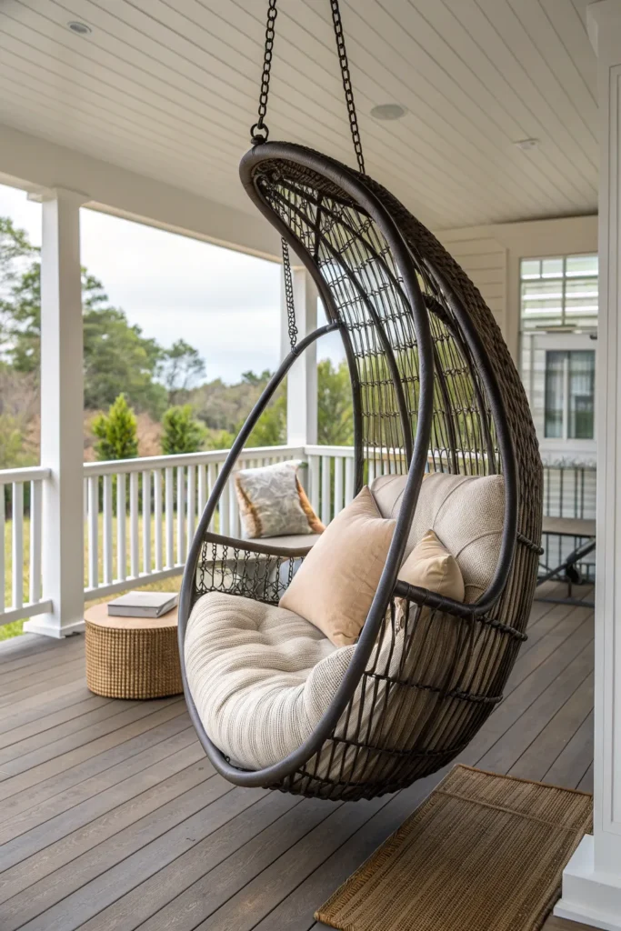 For a modern twist on porch seating, consider a hanging chair or egg chair. These pieces add visual interest and a playful element while still offering comfort. They work best on porches with sufficient ceiling support and space to allow gentle movement.