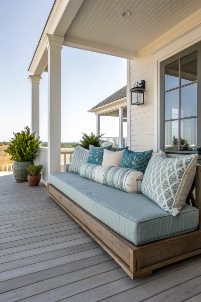 Layer the daybed with cushions and pillows in calming tones to maintain a welcoming atmosphere. This seating option encourages relaxation and makes the porch feel like a destination rather than a pass-through space.