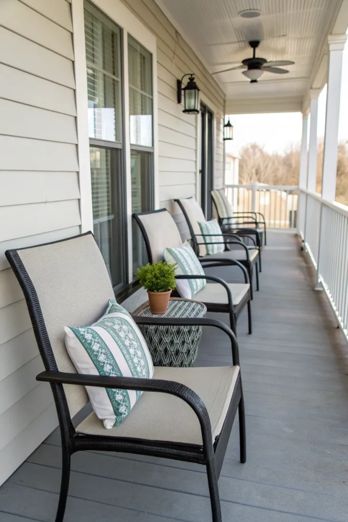 For a cohesive look, choose chairs in a consistent color that complements your home’s exterior. Pair them with a low table for drinks or books, and keep accessories minimal to maintain their easygoing charm.