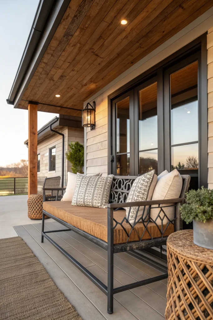 Combining different materials—such as wood, metal, and woven textures—adds depth and character to front porch seating. This approach works especially well for transitional or eclectic homes that blend multiple styles.