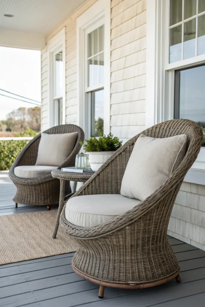 Wicker seating has a natural, breezy quality that works beautifully in outdoor settings. It feels casual yet polished, making it a great option for front porches that aim to feel welcoming without being overly formal. Wicker chairs pair well with a wide range of home styles, from coastal to bohemian to transitional.