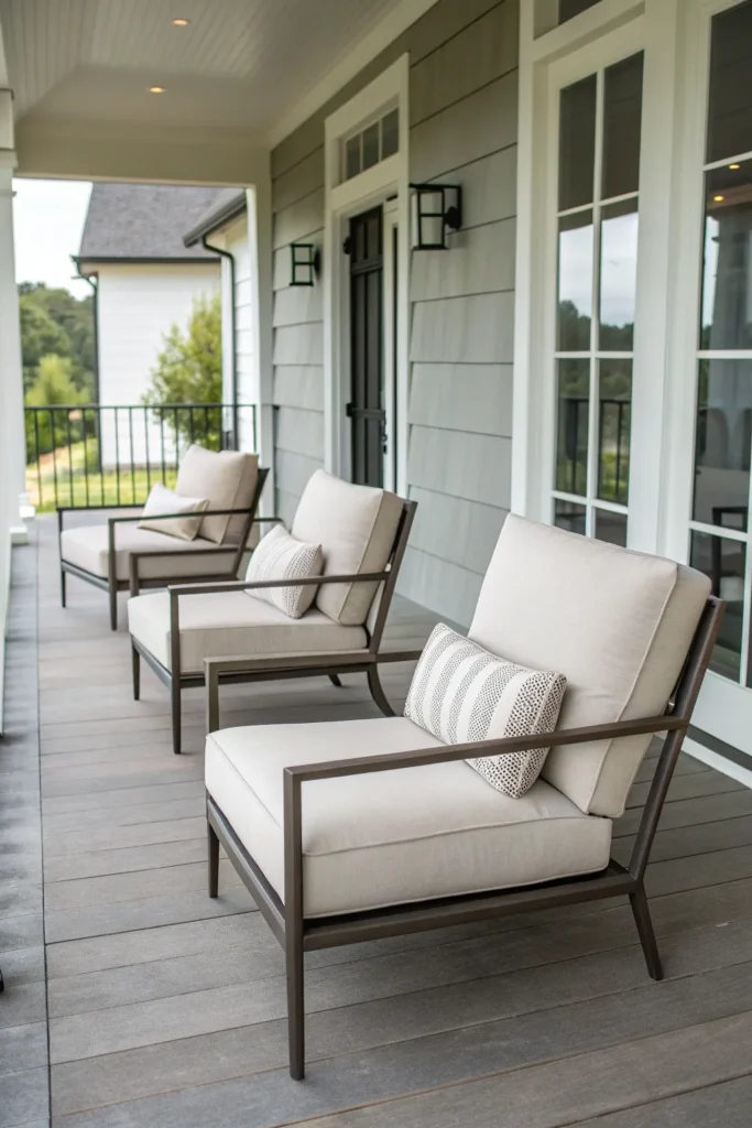 Choose high-quality, weather-resistant fabrics to ensure longevity. Neutral upholstery paired with subtle accent pillows creates a refined yet approachable look.