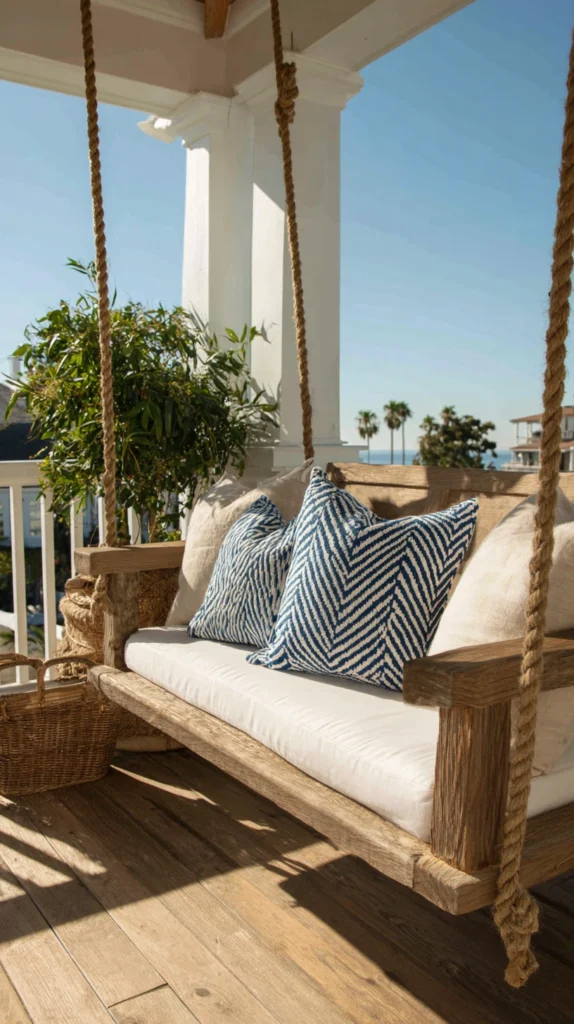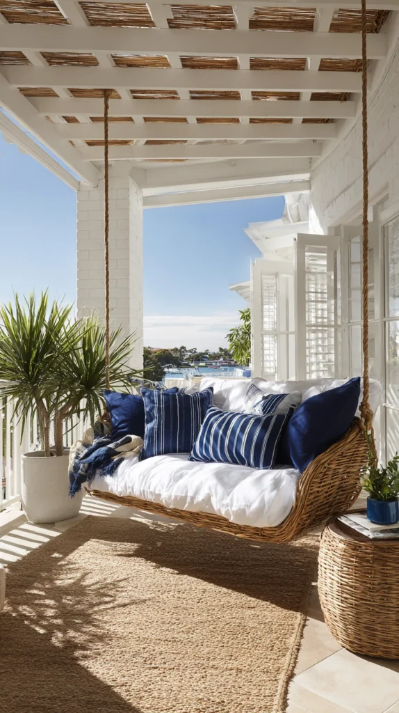 Choose all-weather wicker constructed from UV-resistant resin woven over aluminum or steel frames ensuring durability without the maintenance natural wicker requires, add plush cushions in coastal colors like navy, turquoise, or crisp white creating comfort and color, and hang using rope for authentic nautical character or chains for traditional installation.
