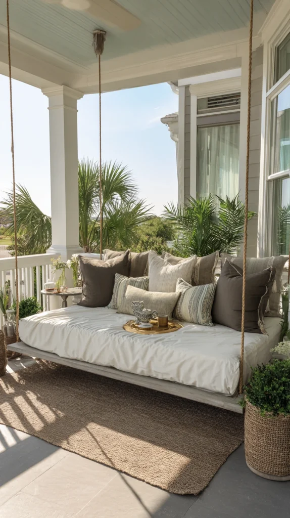 Ensure adequate porch ceiling height and depth accommodating daybed dimensions without overcrowding while installation requires robust ceiling support handling significantly more weight than standard swings. The generous proportions create resort-like luxury while the substantial presence makes dramatic design statements establishing porches as serious outdoor living spaces.