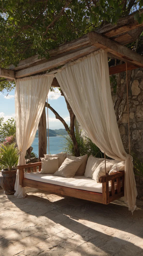 Add romantic charm through swing beds featuring integrated fabric canopies providing shade protection, privacy screening, and dreamy aesthetic appeal creating cozy protected enclosures.