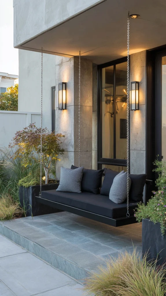 Embrace contemporary aesthetics through sleek minimalist swing designs featuring clean lines, simple forms, and modern materials like powder-coated aluminum or composite materials creating sophisticated updated porch seating.