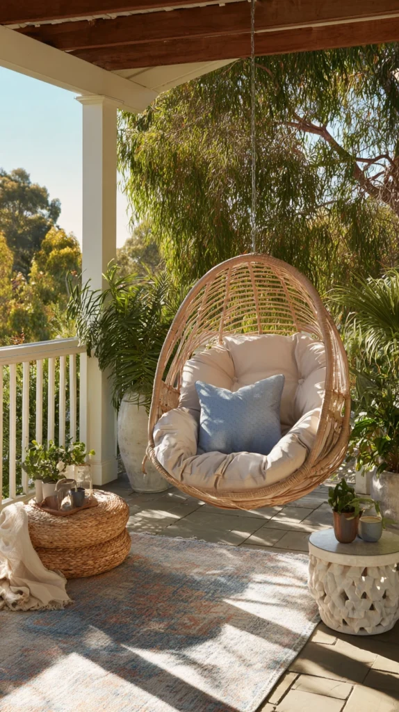 Incorporate single-person hanging chairs or egg chairs creating intimate individual seating options suitable for narrow porches where full swings won’t fit or alongside swings providing varied seating types. Choose woven rattan egg chairs for bohemian character, select macramé hanging chairs creating textural interest, or use contemporary pod chairs in modern materials.