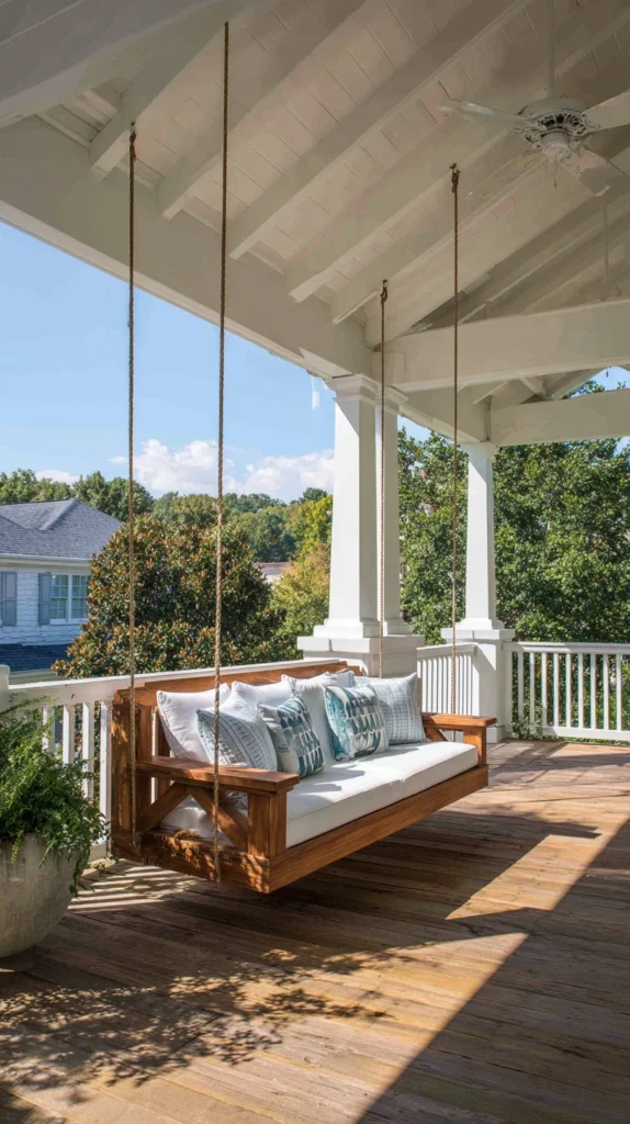 Consider sun exposure and weather patterns positioning swings where they’ll receive appropriate protection or choosing materials and finishes withstanding expected conditions. Add lighting ensuring swings remain usable during evening hours when porches become particularly appealing.