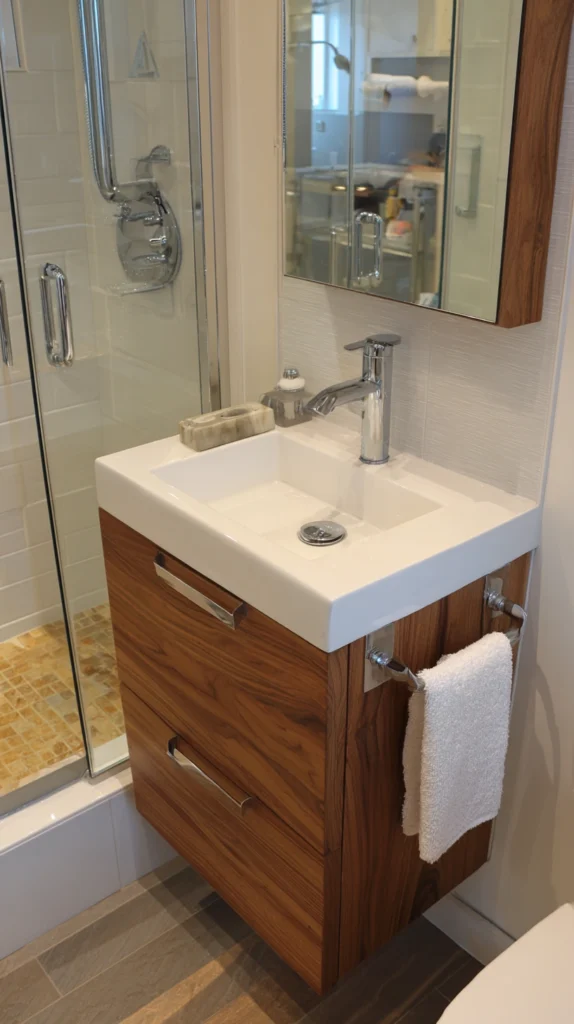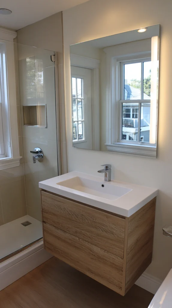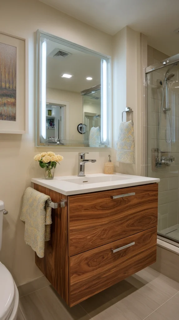 A wall-mounted or floating vanity is one of the smartest moves you can make in any bathroom, regardless of size. By lifting the cabinet off the floor, you expose more of the floor surface beneath it, which tricks the eye into reading the room as larger and more open. It also makes cleaning effortless — no awkward corners to reach around.