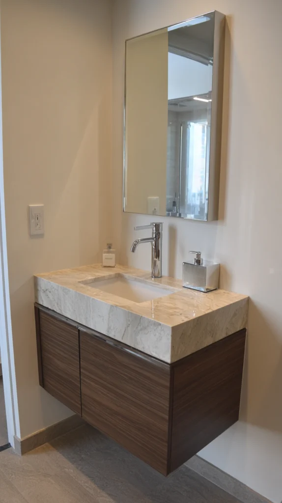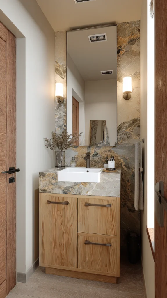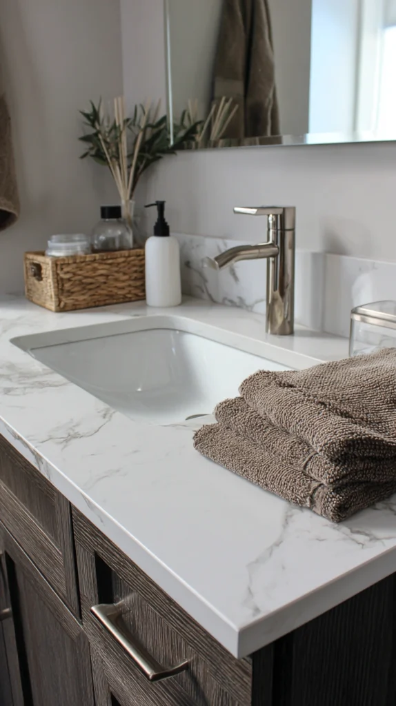 Honed granite brings depth and a more understated elegance. For a more budget-conscious option, sintered stone or high-quality engineered quartz can mimic the look of natural stone convincingly. Whatever you choose, a stone countertop elevates the entire vanity and signals a commitment to quality that elevates the whole room.