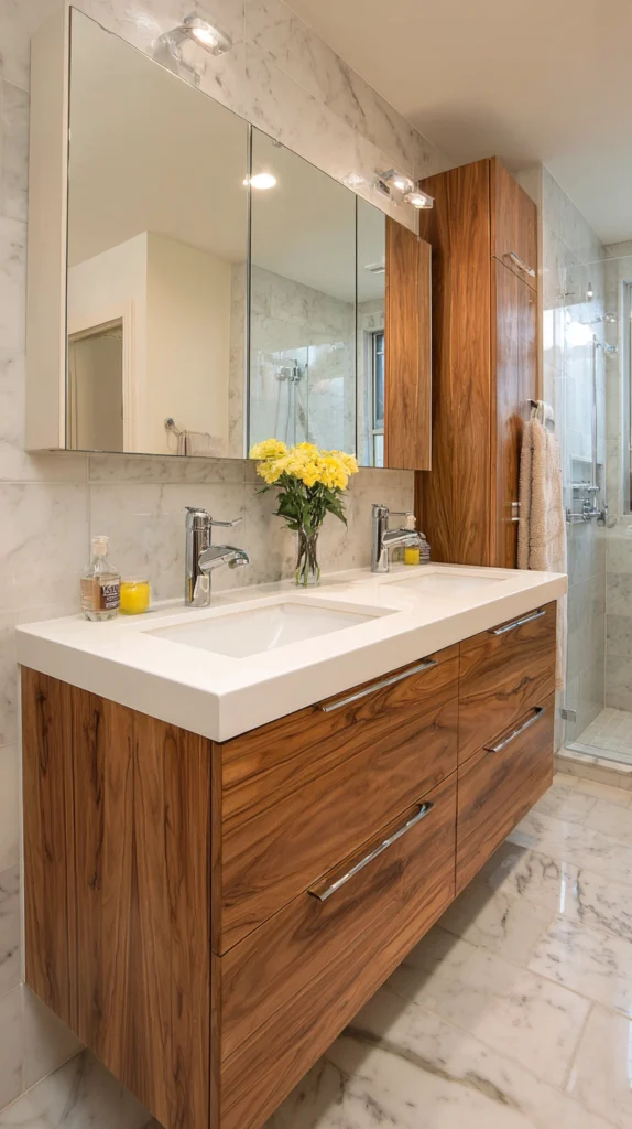 If two people share a bathroom, a double vanity is not a luxury — it’s a necessity. Two sinks, two storage zones, and two mirrors (or one long shared mirror) eliminate the morning bottleneck that turns bathrooms into battlegrounds.