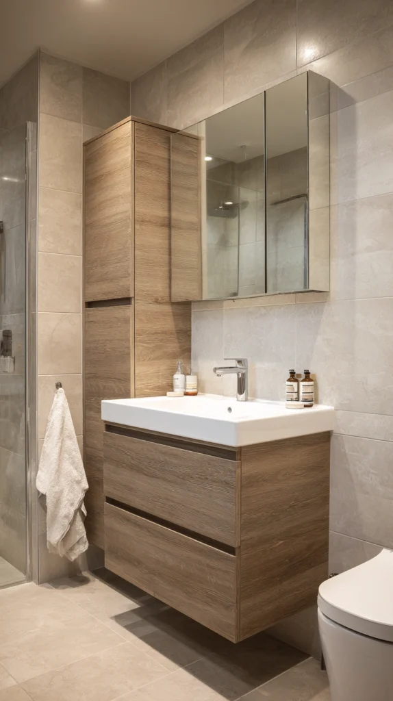 This is particularly effective in narrow bathrooms where floor space is limited but wall height is generous. Keep the cabinet doors simple and handle-free with push-to-open mechanisms so the storage disappears visually into the wall. Use the lower sections for everyday items and the higher shelves for linens, backup supplies, and things you don’t reach for daily.